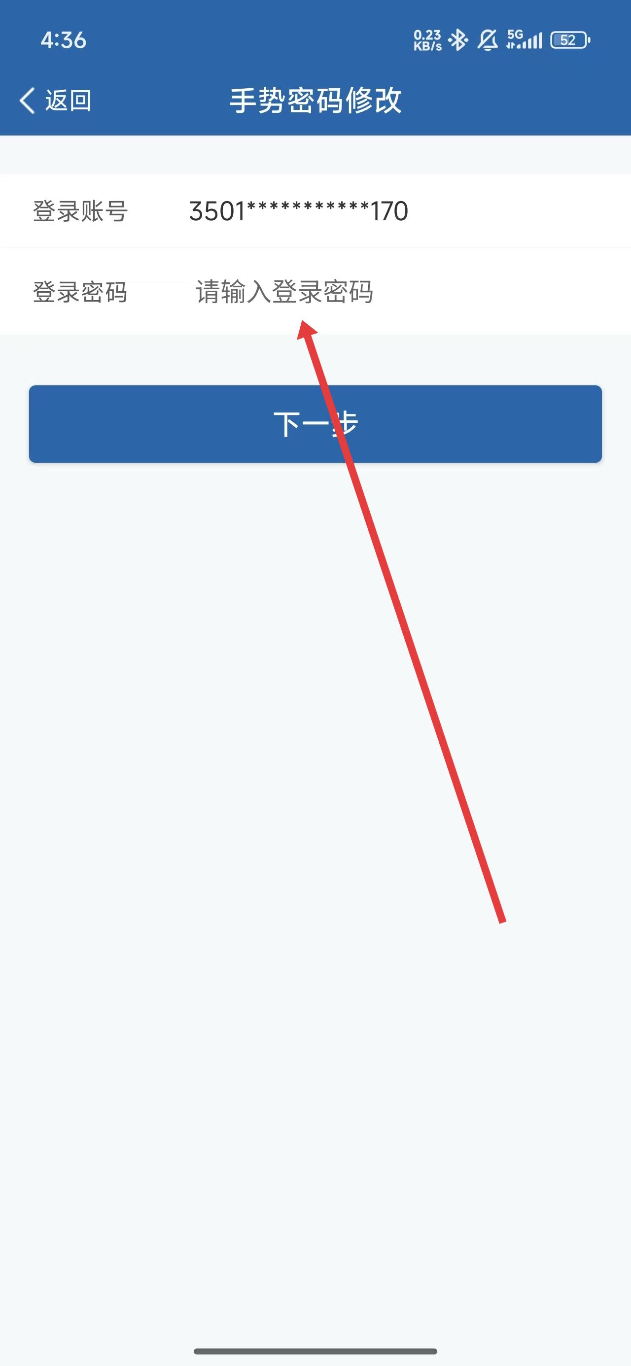 3、在手势密码修改页面中,点击输入框填写登录密码后,开始修改操作。