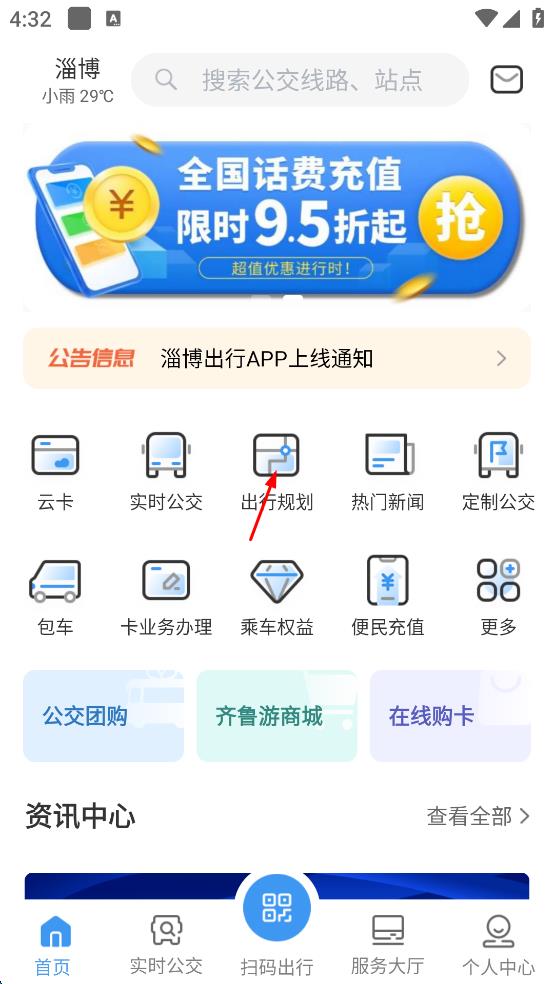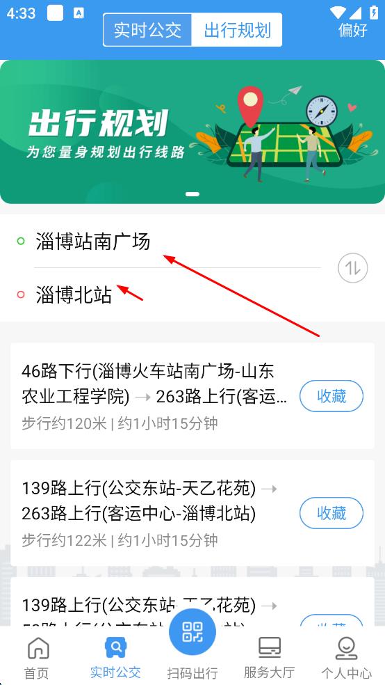 1、打开淄博出行APP,在首页点击“出行规划”,进入规划页面,选择出发地“淄博站南广场”与目的地“淄博北站”。