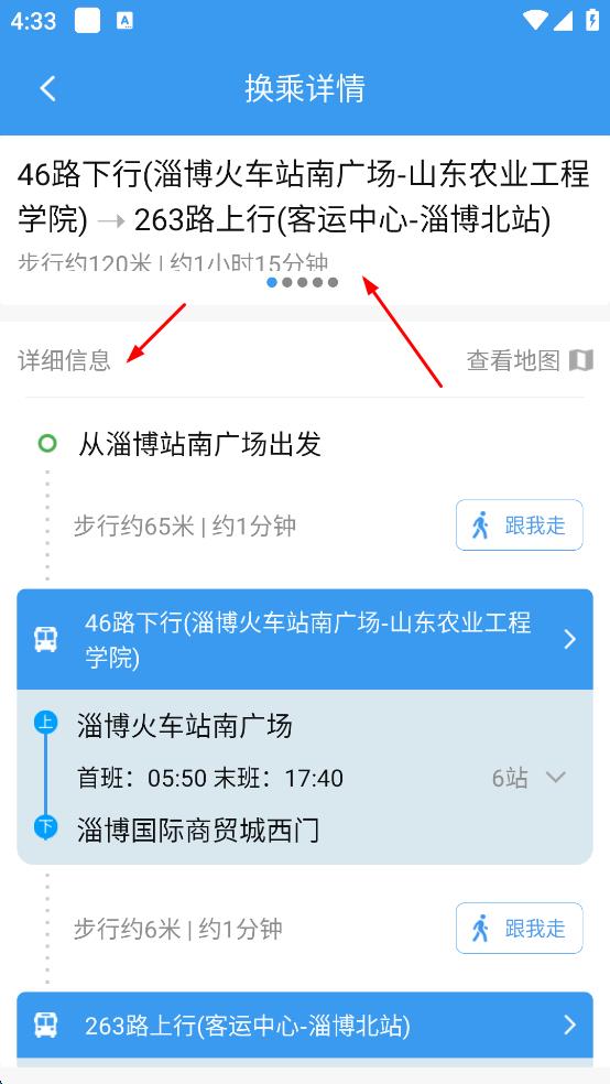 3、在换乘详情页,查看详细信息,包含步行距离、公交首末班车时间等,按指引完成出行。