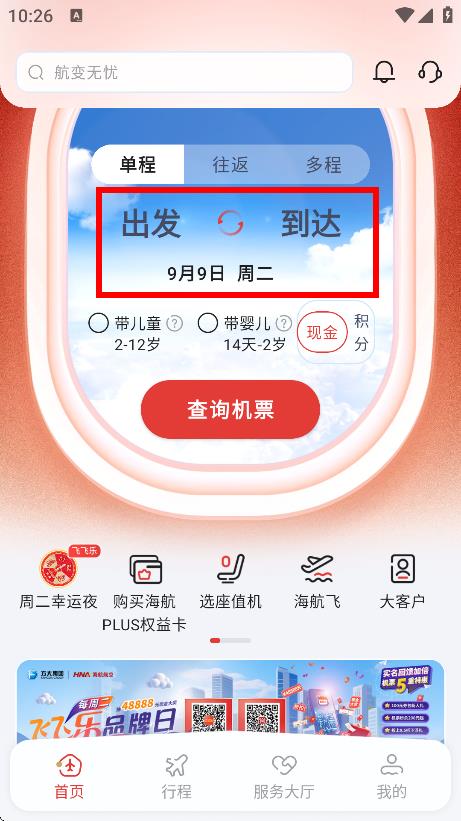 2、随后在首页,设置出发和到达地点及日期。