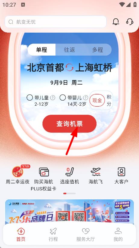 3、设置好行程信息后,点击查询机票,搜索航班。