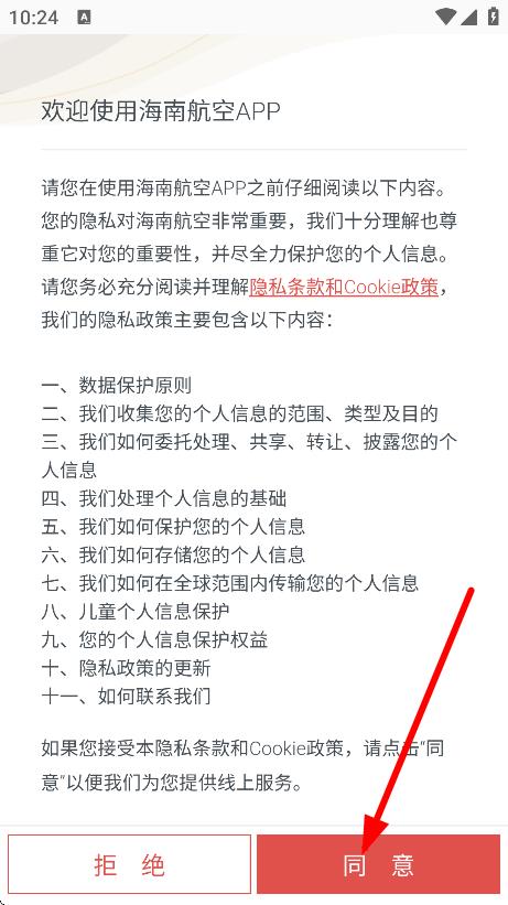 1、在海南航空APP隐私条款页面,点击同意,进入应用。