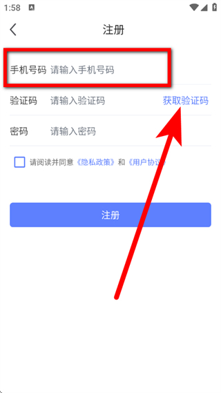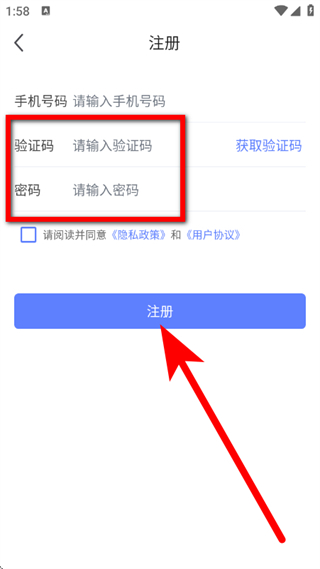 4、输入验证码及密码,勾选协议后,点击注册,完成注册操作。