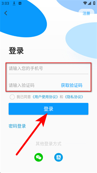 4、在验证码登录页面填写信息,勾选相关协议,点击登录,即可完成账号登录。