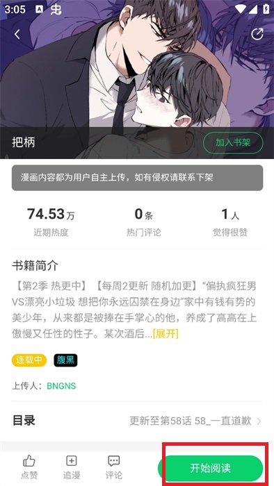 2、然后在漫画作品详情界面,点击下方的【开始阅读】进入到阅读详情界面开始阅读;