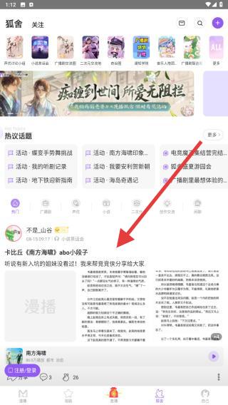 3、互动玩法:社区与直播,进入漫社区发布剧评、参与动态手势舞蹈挑战等热门话题,和同好交流听剧心得,还能参加狐舍抽奖。