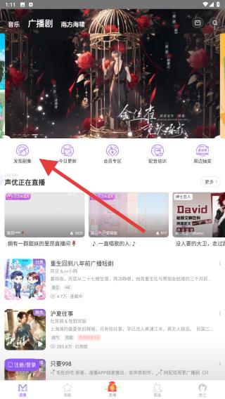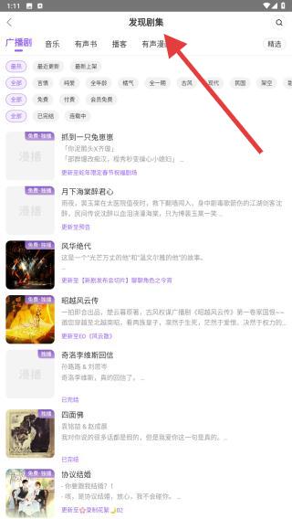 2、核心功能:找剧与收听,首页推荐刷热门作品,或点击顶部发现剧集,按分类筛选 直接搜索栏输入剧名,精准定位目标广播剧。