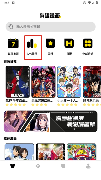 2、确认同意后直接进入软件就可以看到有非常多的漫画作品选择,大家在最上方的人气排行中找寻人气漫画吧;