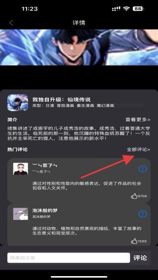 3、在漫画详情页中,点击全部评论的按钮,即可查看所有用户的评论内容。