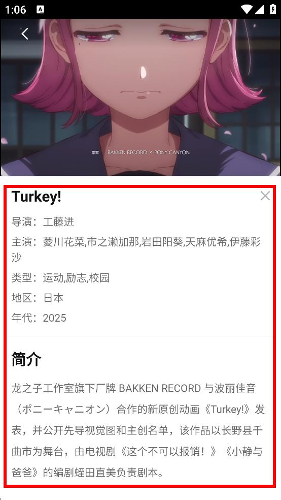 3、在番剧详情页,可查看Turkey的导演、主演等信息及简介。