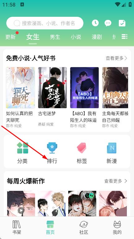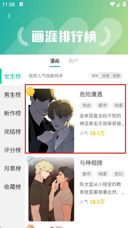 2、在排行榜页面,选择漫画,点击进入漫画详情页。