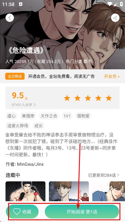 3、在漫画详情页,点击开始阅读第1话,进入漫画阅读页面。