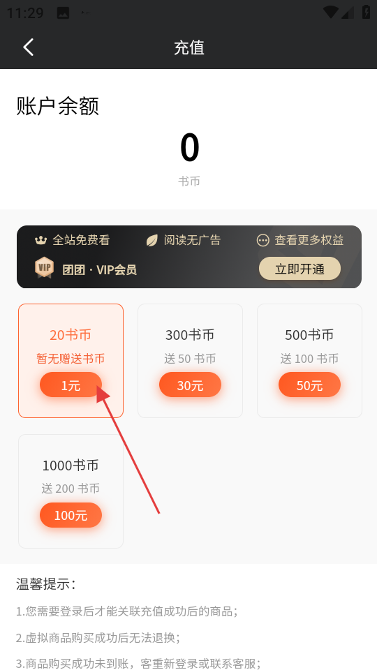 3、在充值页面,选择20书币充值选项。