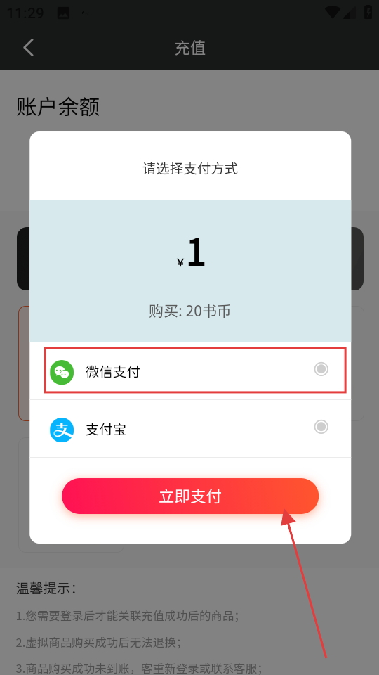 4、在支付方式选择弹窗中,选择微信支付,点击立即支付完成充值。