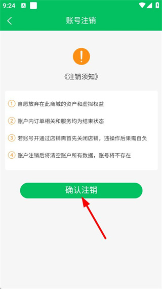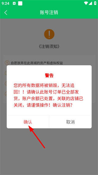 6、在注销警告弹窗中点击确认按钮,完成账号注销。