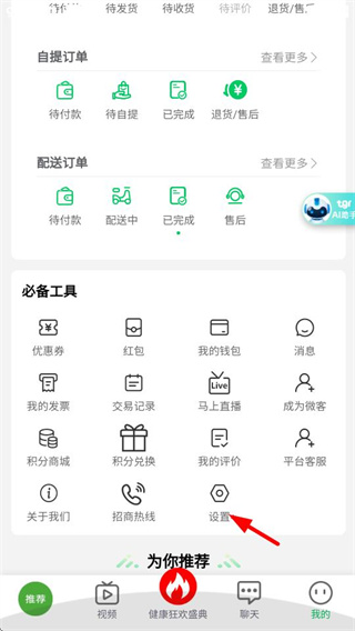 2、在个人页面的必备工具中点击设置,进入设置页面。