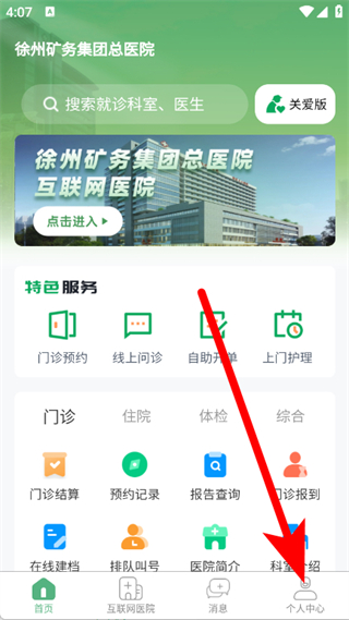 1、打开掌上徐矿总院,点击底部导航栏个人中心。