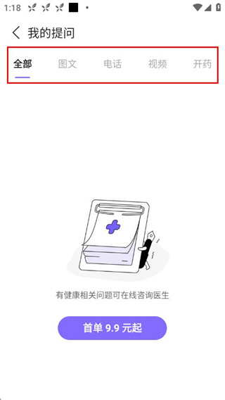 3、在我的提问页面,通过全部、图文等标签页,查看对应的提问记录。