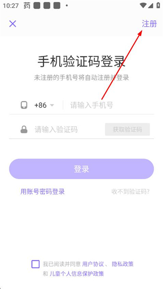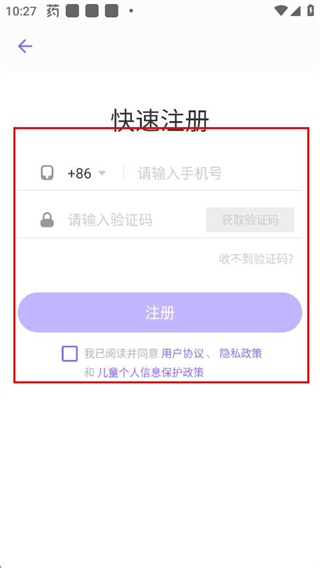 4、输入手机号码、获取并填写验证码,勾选同意协议后点击注册。