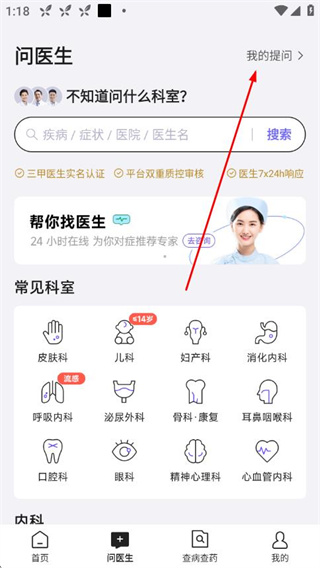 2、在问医生页面点击右上角的我的提问,进入我的提问页面。