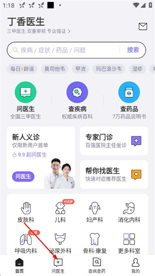 1、打开丁香医生app首页,点击底部问医生,进入问医生页面。