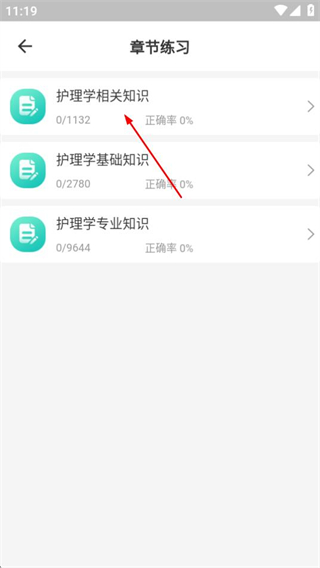 2、在章节练习页面点击护理学相关知识选项,进入对应分类页面。
