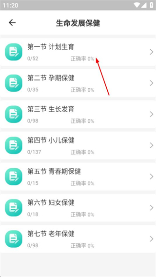 4、在生命发展保健页面点击第一节计划生育选项,进入题目页面。
