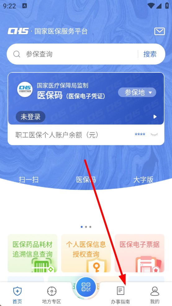 1、打开国家医保服务平台APP,点击页面底部导航栏的「办事指南」,进入办事指引界面。