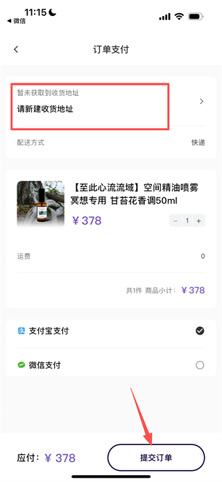 5、在支付页面,添加收货地址后选择支付方式,点击提交订单完成购买。