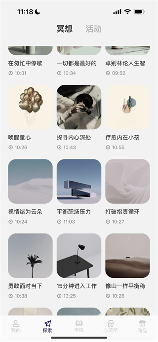 按需求划分压力缓解专注提升睡眠改善等板块,支持4分钟8分钟等短时版本,适配通勤工作间隙等碎片化时间,无需长时间投入即可快速开展身心调节练习。