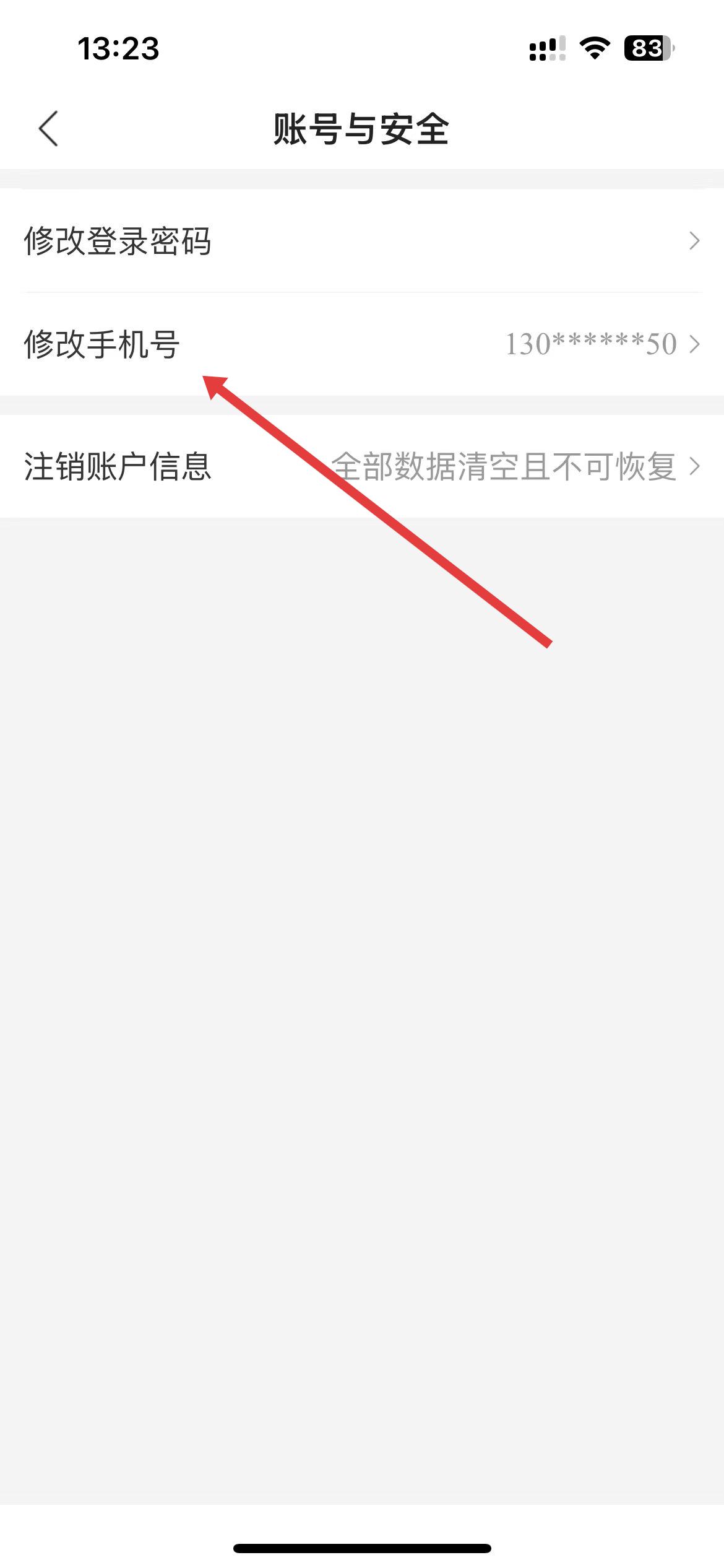 4、在账号与安全页面中,点击修改手机号选项,进入修改手机号操作页面。