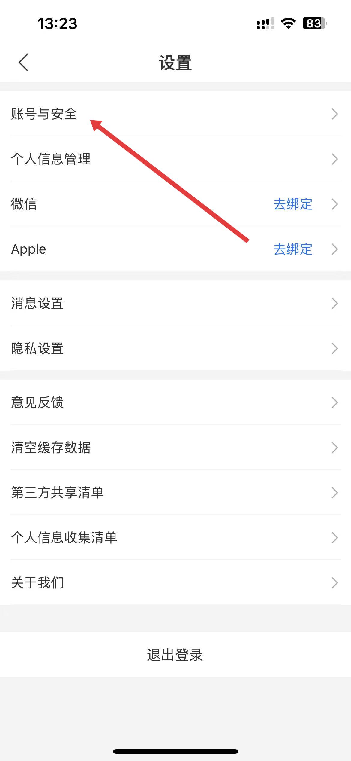 3、在设置界面里,点击账号与安全选项,进入账号安全相关设置页面。