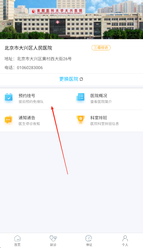 2、切换到底部导航就诊页面,选定北京市大兴区人民医院后,点击预约挂号功能,依据指引确认就诊信息,提交预约申请,还可查看医院概况了解机构详情。