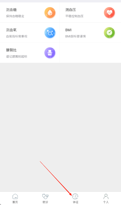 3、进入体征页面,按需选择测血糖测血压等检测功能,按照APP提示准备检测工具,规范操作采集数据,完成后可查看检测结果,辅助健康管理。