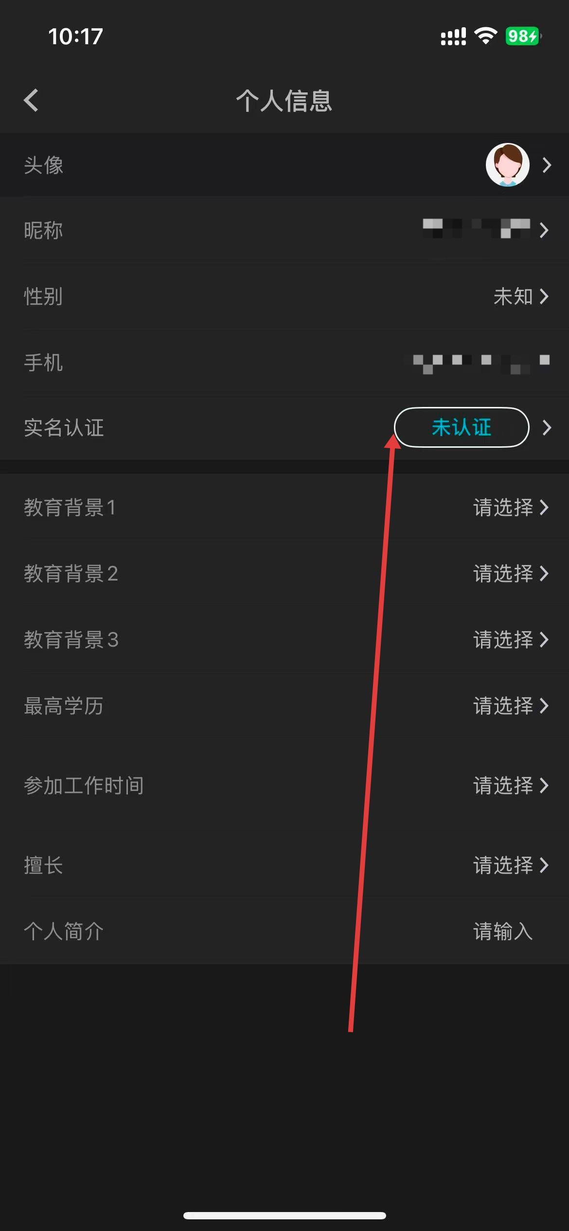 3、在个人信息页面,找到并点击实名认证选项。