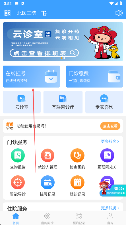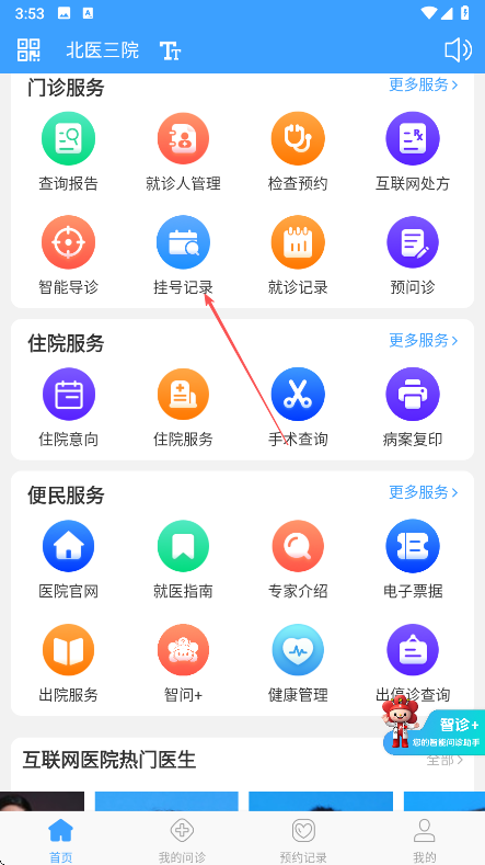 3、挂号成功后,可在首页门诊服务板块中点击挂号记录查看预约详情。