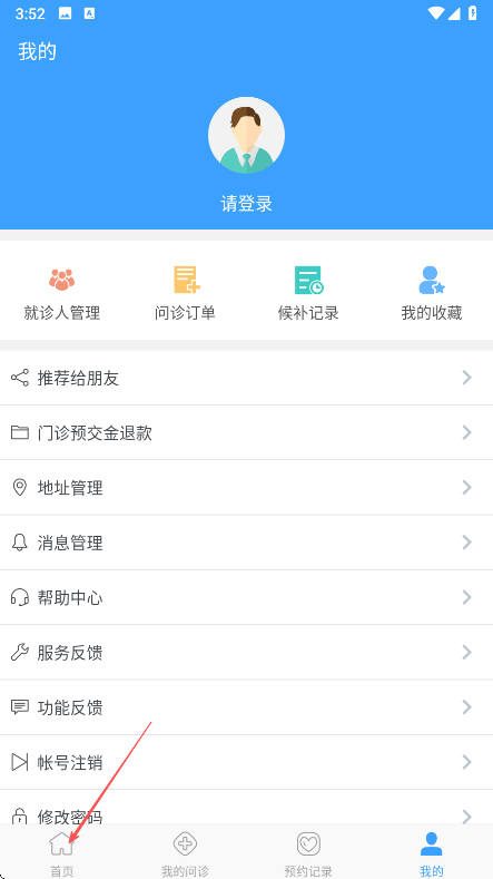 2、登录后,点击底部菜单栏中的首页,回到首页界面,点击在线挂号选项。