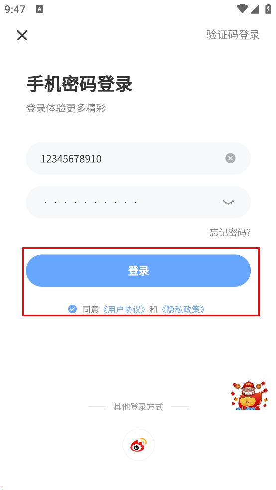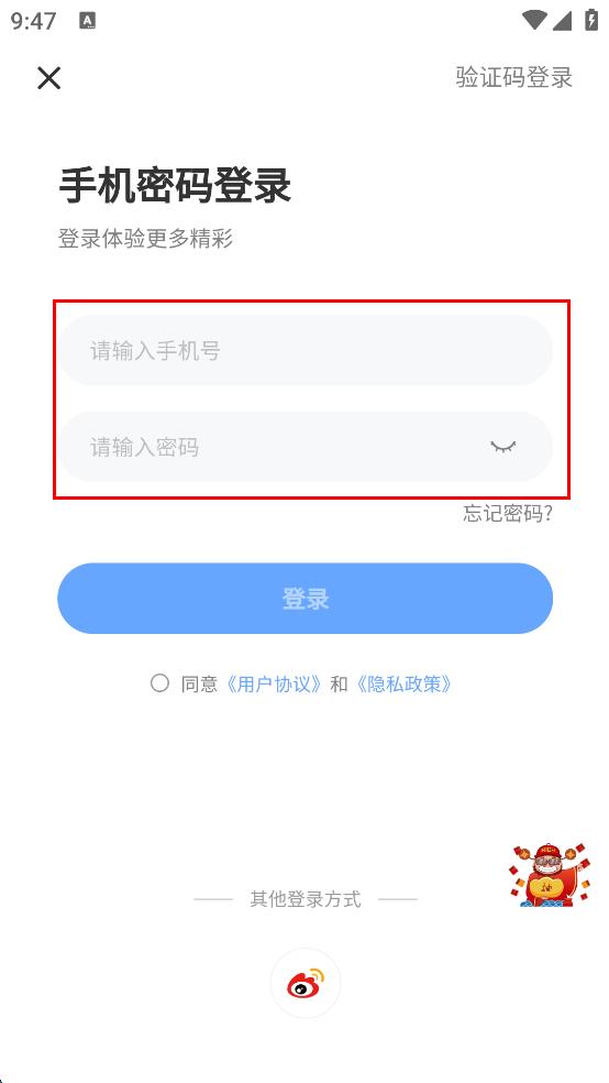 3、在登录界面,选择手机密码登录方式,依次输入手机号和密码,完成信息填写。