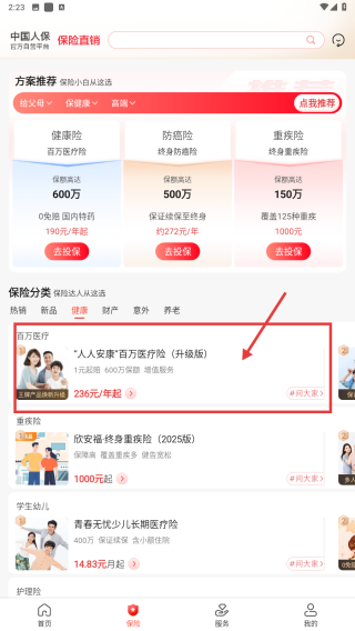 3、在健康保险产品列表中,找到人人安康百万医疗险升级版,点击进入产品详情页。
