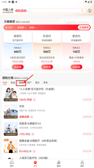 2、在保险营销页面,点击健康分类,浏览健康保险产品列表。