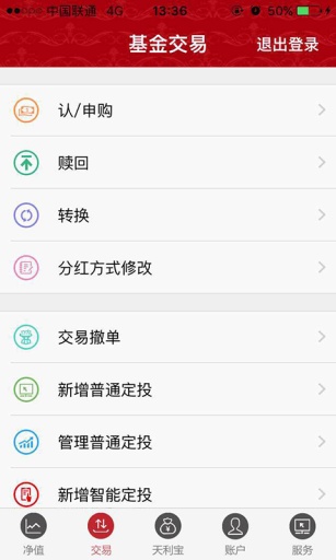4、 个人信息维护:支持更改账户资料、修改分红方式、管理定投协议、修改交易密码等个人信息维护
