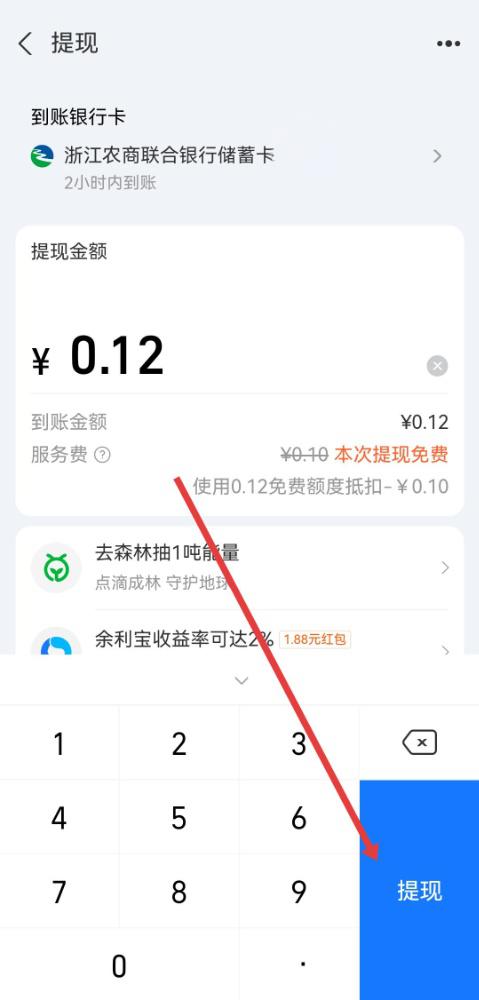 3、选择目标到账银行卡,在提现金额输入框填写金额,确认服务费及到账信息后,点击右下角蓝色提现按钮,完成提现流程。
