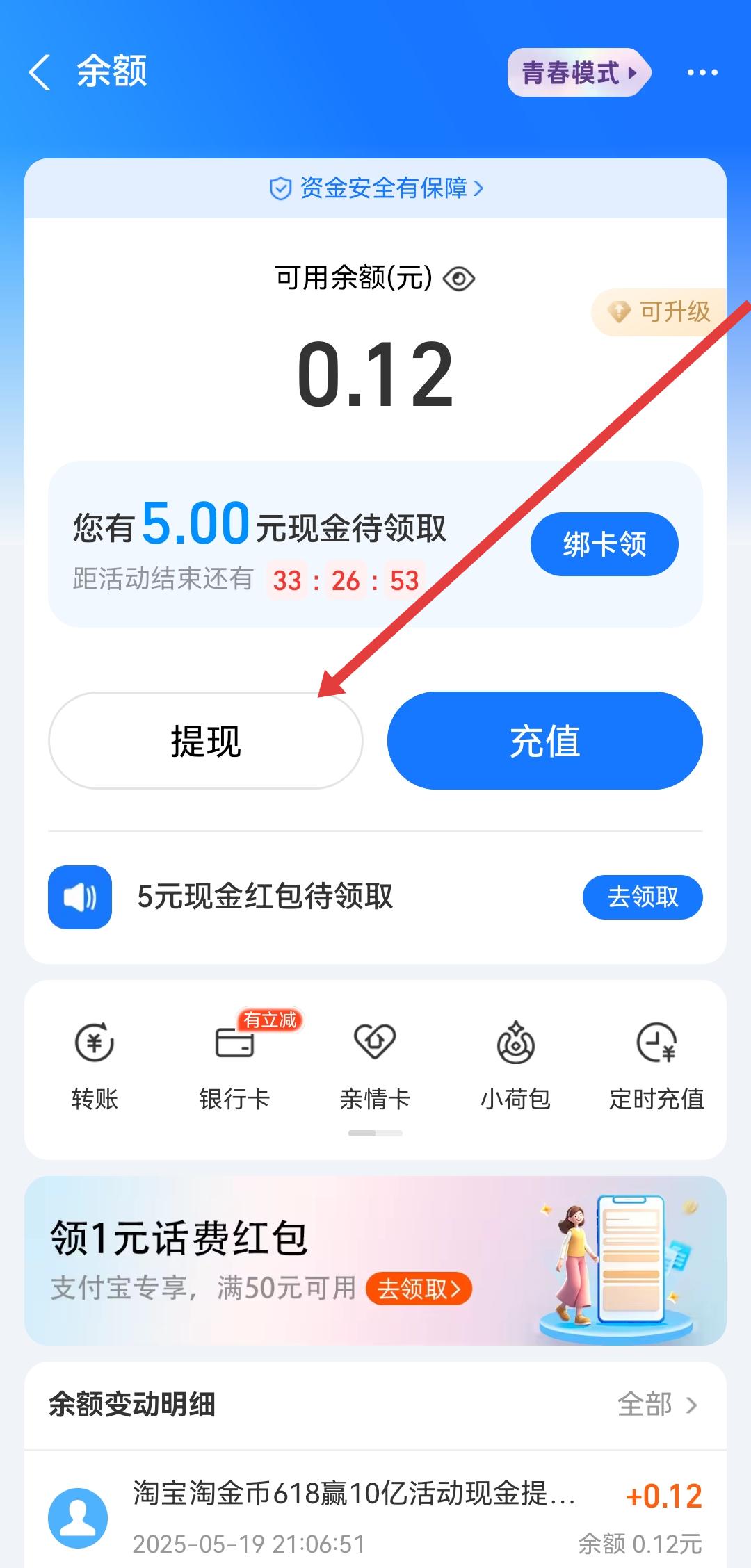 2、在余额的页面,可以查看可用余额后,点击提现按钮位于可用余额下方,左侧白色按钮,进入提现设置页面。