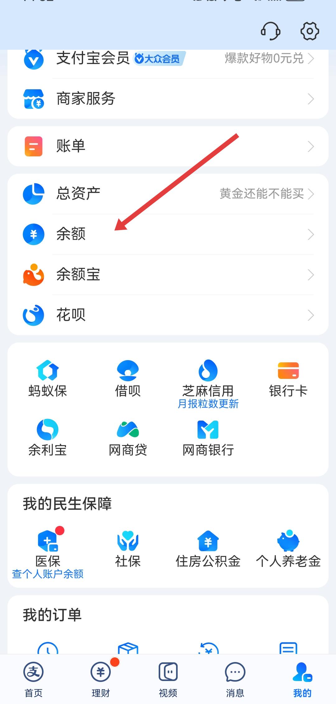 1、打开支付宝切换至底部我的页面,在资产栏中找到并点击余额的选项,进入余额账户详情界面。