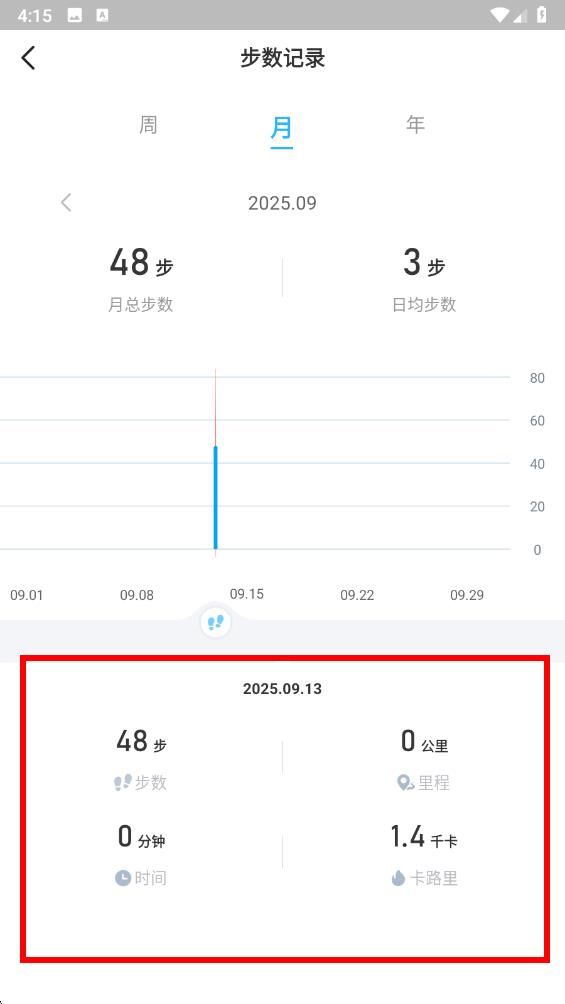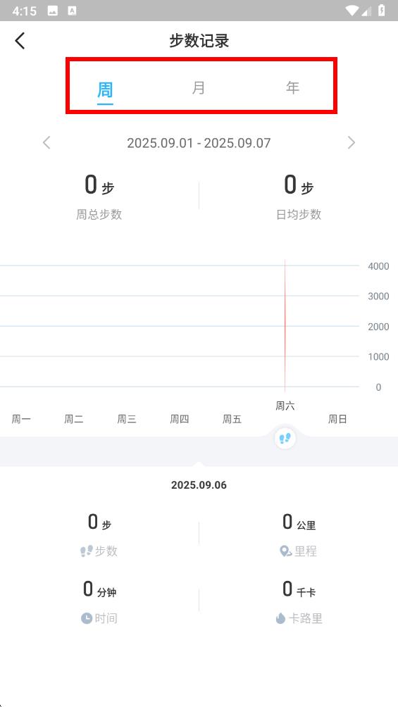 3、点击月或年标签,能切换查看对应时间维度的步数记录。