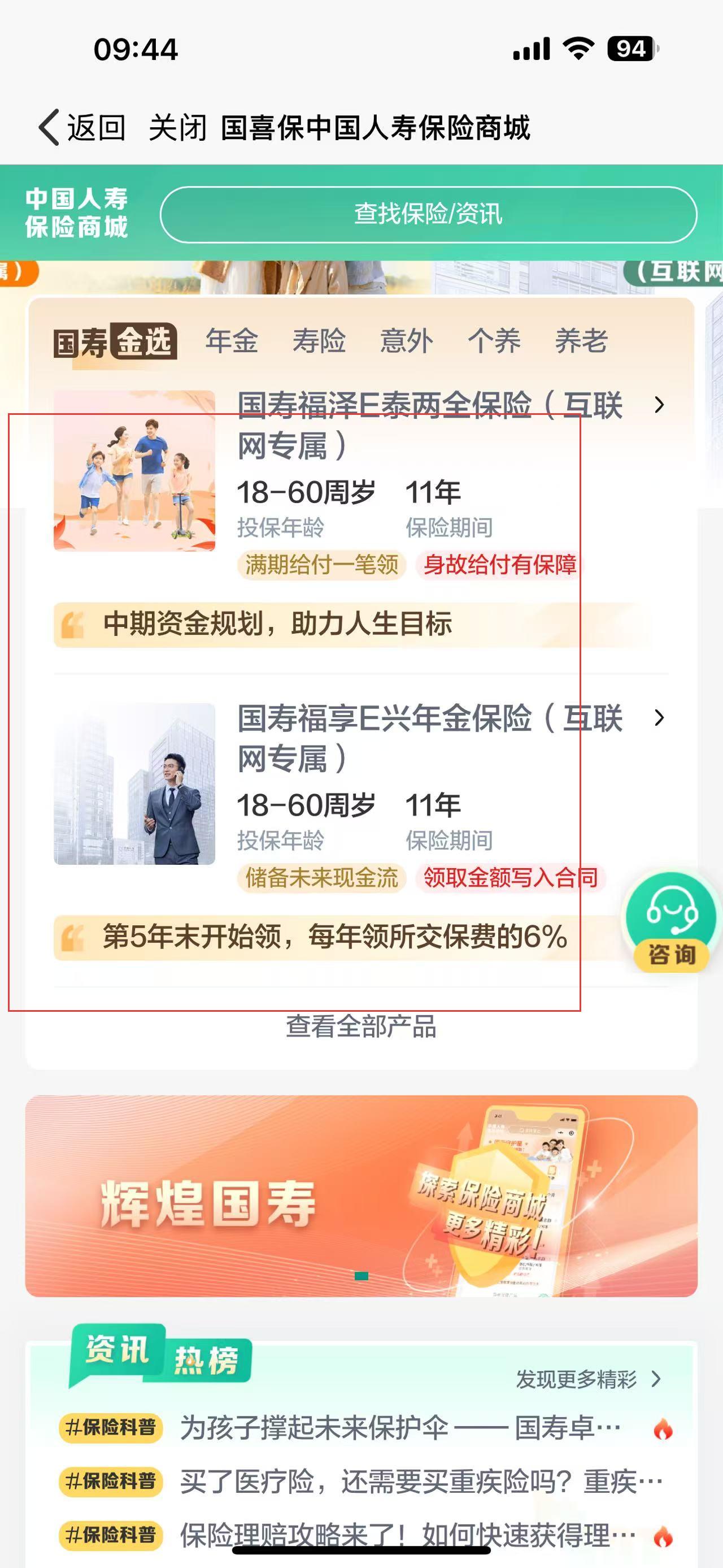 2、进入保险商城后,能看到各类保险产品展示,每个产品都有投保年龄、保险期间、保障责任等详细介绍,选定符合自身需求的保险产品。