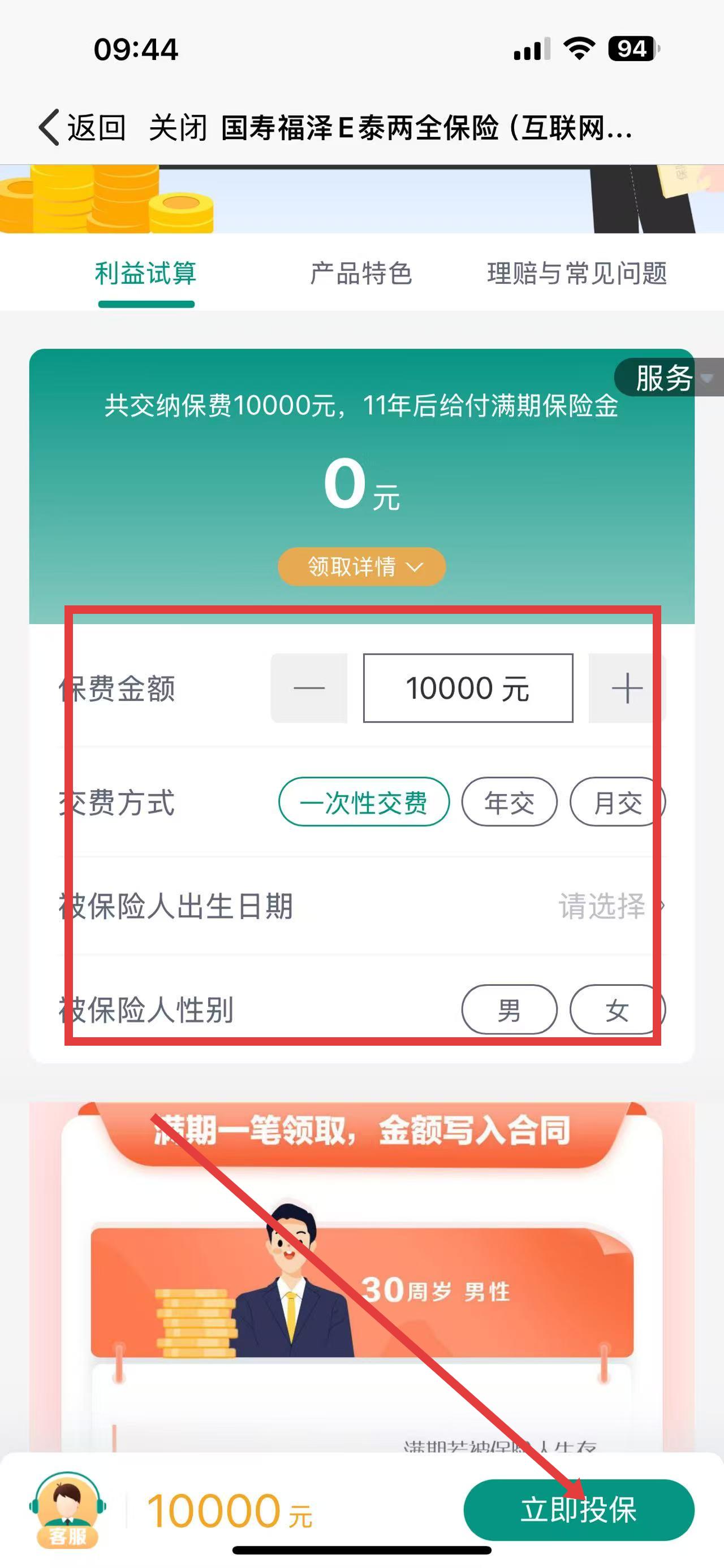 3、点击选定产品进入详情页,填写保费金额、选择交费方式,完善被保险人出生日期、性别等信息,确认无误后,按指引完成后续投保操作。
