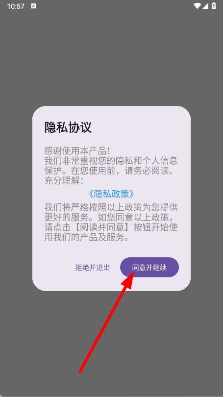 1、打开APP,在弹出的隐私协议提示框中点击同意并继续。