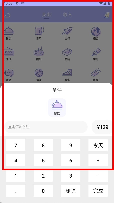 4、选择支出或收入分类,填写金额,也可添加备注,填写完成后即可完成账单记录。