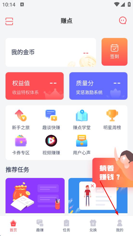 1、进入赚点软件首页,点击右下角我的选项,进入个人页面。